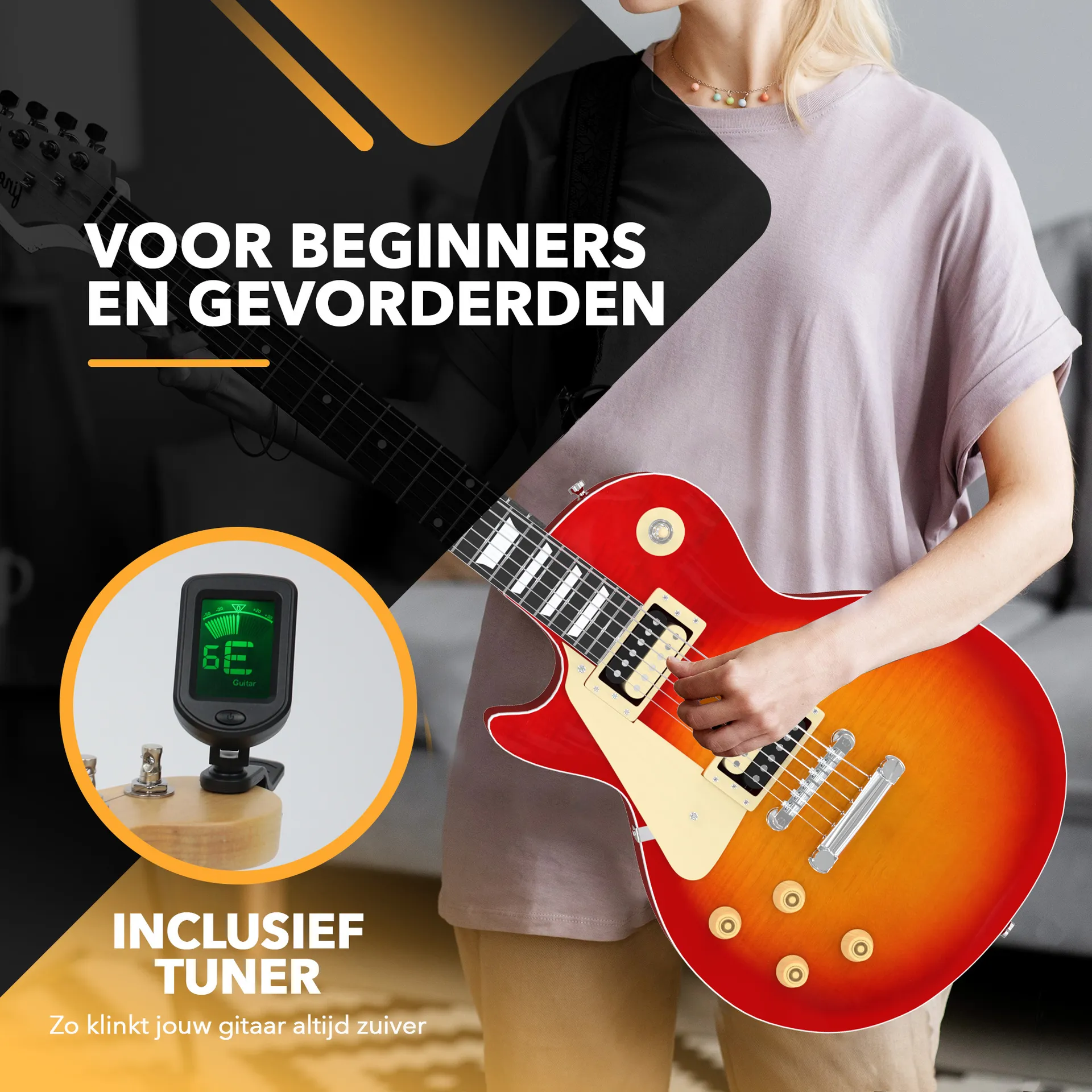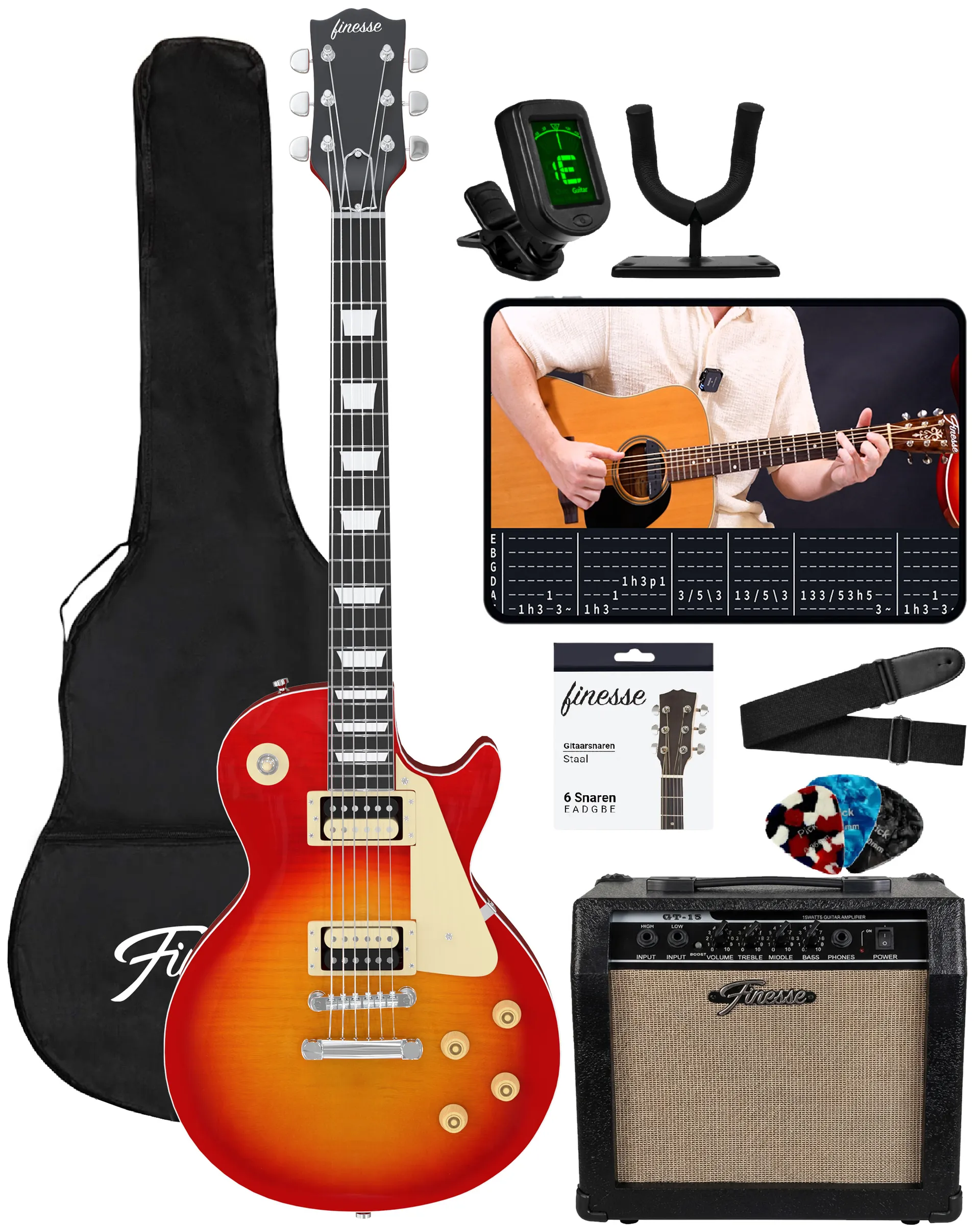 Om jouw nieuwe avontuur zo leuk en gemakkelijk mogelijk te maken, krijg je deze gitaar nu inclusief een heel scala aan onmisbare accessoires. Zo krijg je een versterker, jack kabel, stevige draagtas, extra snaren, plectrums, gitaarband, stemapparaat en muurbevestiging om zo snel en leuk mogelijk gitaar te leren spelen.